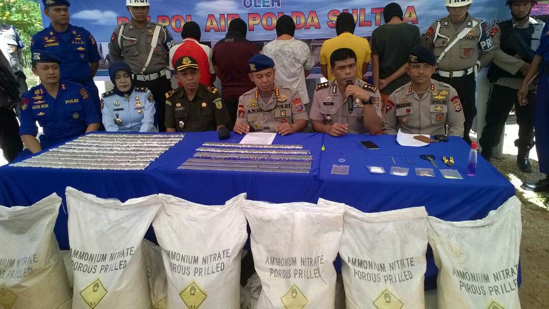 “Berdasarkan hasil pengembangan dari kasus tanggal 30 April 2017 dengan tersangka inisial CN, maka pada hari Sabtu, tanggal 13 Mei 2017 pukul 17.00 wita personil subdit Gakkum Dit Polair Polda Sultra bersama dengan personil Kp Perenjak 5017 Mabes Polri telah melakukan penangkapan terhadap Amir Bolong bin Madi Ahmad (54) yang menguasai ammonium nitrat sejenis bahan peledak sebanyak 1500 Kg atau 1,5 Ton di pesisir pantai Kololaro, Kecamatan Laonti Kabupaten Konsel, barang bukti tersebut ditemukan di dalam rumah tersangka yang terletak di Pantai Kololaro,” ungkap Direktur Polair Polda Sultra, Kombes Andi Anugrah dalam press release di Mako Brimob Polda Sultra, Jum’at (19/05/17).