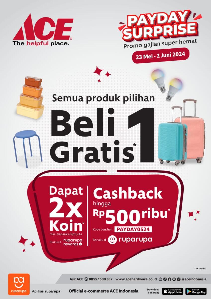 Kendari, Radarsultra.co – Mulai 23 Mei hingga 2 Juni 2024 ini, Ace Hardware Kendari menghadirkan promo Payday Surprise untuk para pelanggannya.