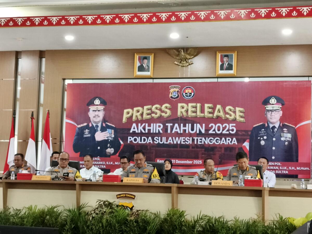 Kendari, Radarsultra.co — Kepolisian Daerah Sulawesi Tenggara (Polda Sultra) menggelar press release akhir tahun 2025 sebagai bentuk transparansi dan akuntabilitas kinerja kepada publik. Kegiatan berlangsung di Aula Dhacara Mapolda Sultra, Rabu (31/12/2025), dan dipimpin langsung Kapolda Sultra Irjen Pol Didik Agung Widjanarko, didampingi Wakapolda Sultra Brigjen Pol Dr. Gidion Arif Setyawan, Irwasda Polda Sultra Kombes Pol Hartoyo, serta jajaran Pejabat Utama (PJU) Polda Sultra.