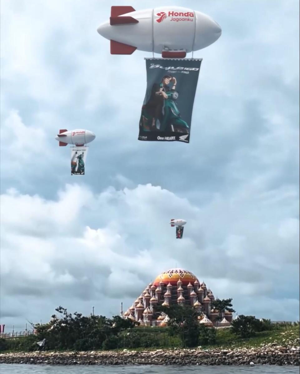 Selain bertuliskan Honda, balon udara yang menghiasi Kota Makassar membawa spanduk bergambar New Honda Stylo 160, yang merupakan skutik premium fashionable 160cc pertama di Indonesia.