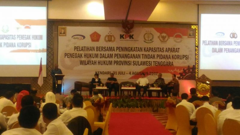 Bertempat di Hotel Grand Clarion Kendari, Sulawesi Tenggara (Sultra), KPK melatih sebanyak 164 aparat penegak hukum di sultra, yang terdiri dari 55 penyidik Polda Sultra, 4 penyidik pada baeeskrim Polri, 55 penyidik dan jaksa penuntut kejati Sultra, 4 penyidik dan jaksa penuntut Direktorat Penyidikan pada Jampidsus kejaksaan RI, 10 auditor BPK dan 10 auditor BPKP Sultra, selain itu 22 penyidik POM TNI meliputi angkatan darat, laut, udara dan Oditur Jenderal babinkum masing masing 2 peserta dari kedeputian bidang pemberantasan pada PPATK dan penyidik pegawai negeri sipil OJK.