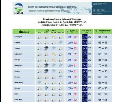Badan Meteorologi, Klimatologi, dan Geofisika (BMKG) Kendari melakukan prakiraan cuaca untuk wilayah Sulawesi Tenggara (Sultra). 8 daerah diperkirakan berpotensi hujan ringan hingga lebat disertai guntur dan angin kencang hingga sore hari pada tanggal 13 April 2017.