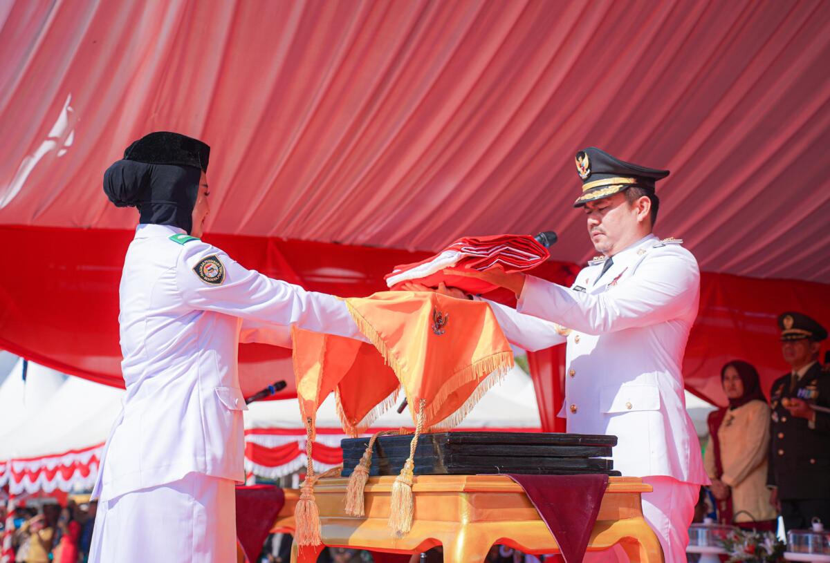 Koltim, Radarsultra.co – Bupati Koltim, Abd Azis SH MH, menjadi Inspektur Upacara Pengibaran Bendera Merah Putih, dalam rangka peringatan HUT Ke-79 RI Tahun 2024 yang berlangsung dilapangan upacara Kelurahan Atula Kecamatan Ladongi, Sabtu (17/8/2024)