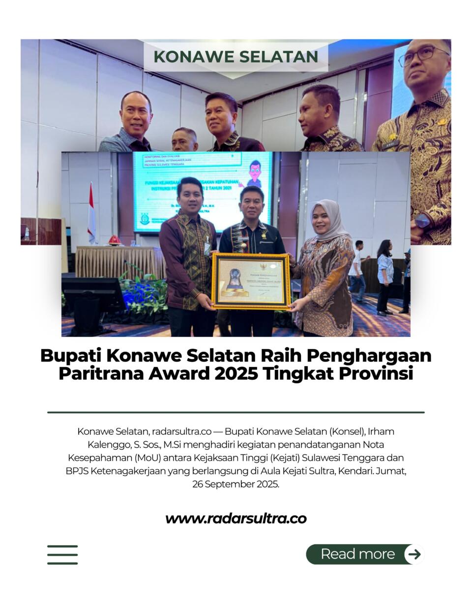 Pada kesempatan yang sama, Bupati Irham Kalenggo juga menerima Penghargaan Paritrana Award Tahun 2025 Tingkat Provinsi Sulawesi Tenggara, sebagai bentuk apresiasi atas dukungan dan komitmen Pemerintah Kabupaten Konawe Selatan dalam mendorong perlindungan jaminan sosial bagi para pekerja, baik di sektor formal maupun informal.