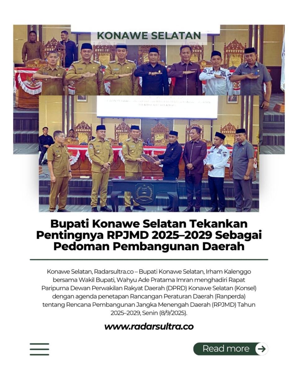 “RPJMD ini menjadi komitmen kita bersama untuk memastikan setiap program pembangunan tepat sasaran dan memberi manfaat nyata bagi masyarakat. Dengan arah kebijakan yang jelas, kita berharap tercipta pemerataan pembangunan serta peningkatan kualitas hidup masyarakat Konawe Selatan,” tegasnya.***