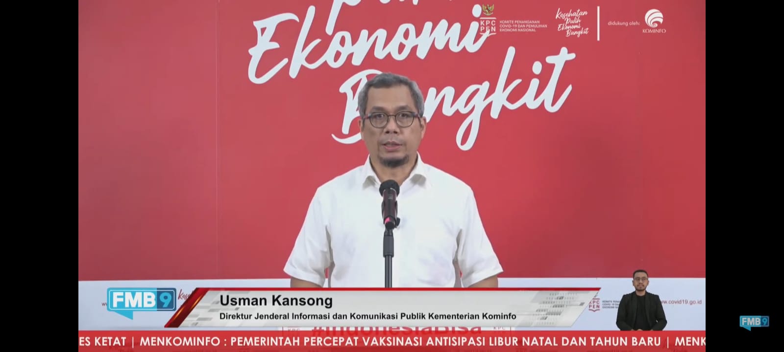 Direktur Jenderal Informasi dan Komunikasi Publik Kementerian Kominfo, Usman Kansong menyatakan, meski penanganan pandemi di Indonesia menunjukkan perbaikan signifikan dan terkendali pada tingkat rendah, namun semua pihak harus