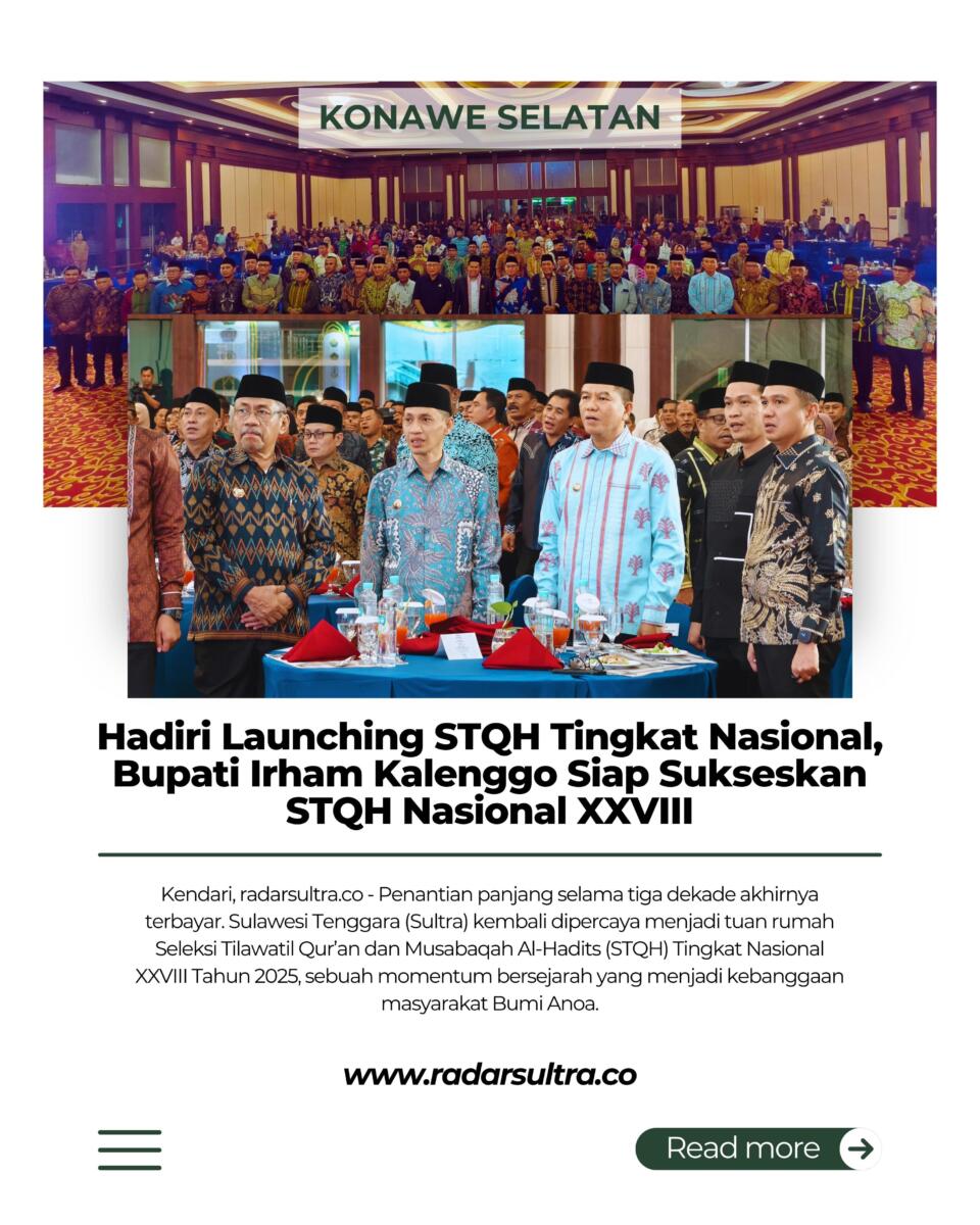 “Konawe Selatan adalah bagian yang tak terpisahkan dari Sulawesi Tenggara. Kami siap menyambut dan mensukseskan STQH Nasional karena moment ini menjadi momentum memperkuat kecintaan kita pada Al-Qur’an dan mempererat persaudaraan umat,” ujar Bupati Irham Kalenggo dengan penuh semangat.