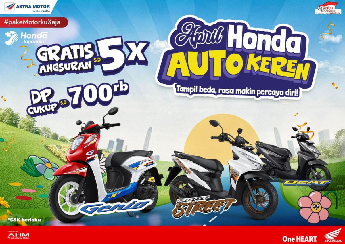 Dalam promo tersebut, konsumen berkesempatan memiliki Honda Genio, Honda Beat Street, dan Honda Beat dengan uang muka hanya Rp700 ribu serta gratis angsuran hingga lima kali. Penawaran ini menjadi solusi bagi masyarakat yang menginginkan motor matic ekonomis dengan tampilan stylish.