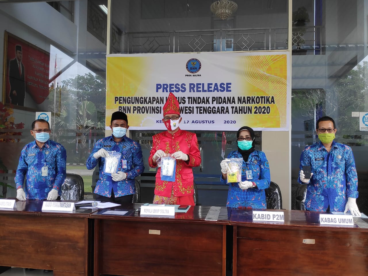 Kendari, Radarsultra.co.id – Tepat di HUT RI ke 75 ini, Badan Narkotika Nasional Provinsi Sulawesi Tenggara (BNNP Sultra) mengumumkan penangkapan kasus tindak pidana Narkotika di Kantor BNNP Sultra.