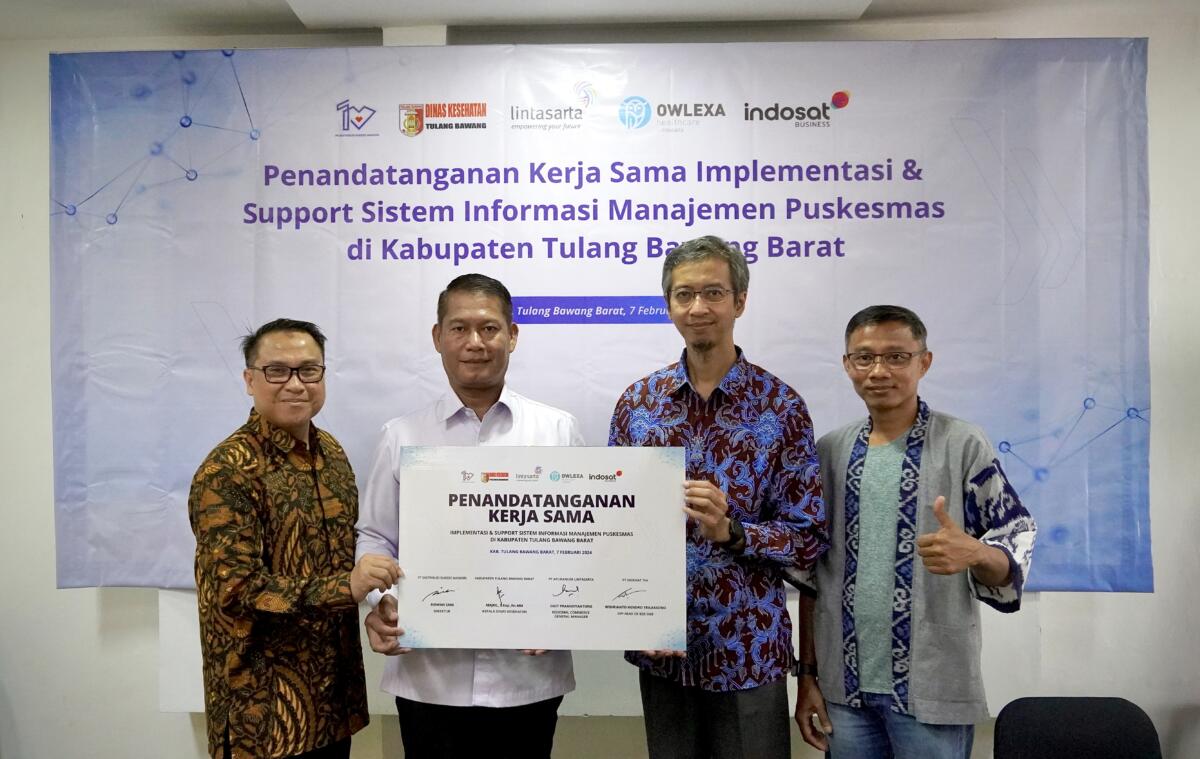 Lampung, Radarsultra.co – PT Indosat Tbk (Indosat Ooredoo Hutchison, Indosat, atau IOH) melalui Authorized Channel Partner (ACP) Indosat Business yaitu PT Distribusi Sukses Mandiri (DSM) bersama PT Aplikanusa Lintasarta (Lintasarta) melalui business unit-nya Owlexa Healthcare, mengumumkan kemitraan strategis untuk implementasi dan dukungan digitalisasi pada fasilitas kesehatan (Faskes) 16 Puskesmas dan 1 klinik di Kabupaten Tulang Bawang Barat (Tubaba), Lampung. Kolaborasi ini ditandai dengan penandatanganan komitmen kerja sama antara Indosat Business, Lintasarta, DSM dan Dinas Kesehatan Kabupaten Tubaba di Tulang Bawang Barat, Lampung pada awal Februari lalu.
