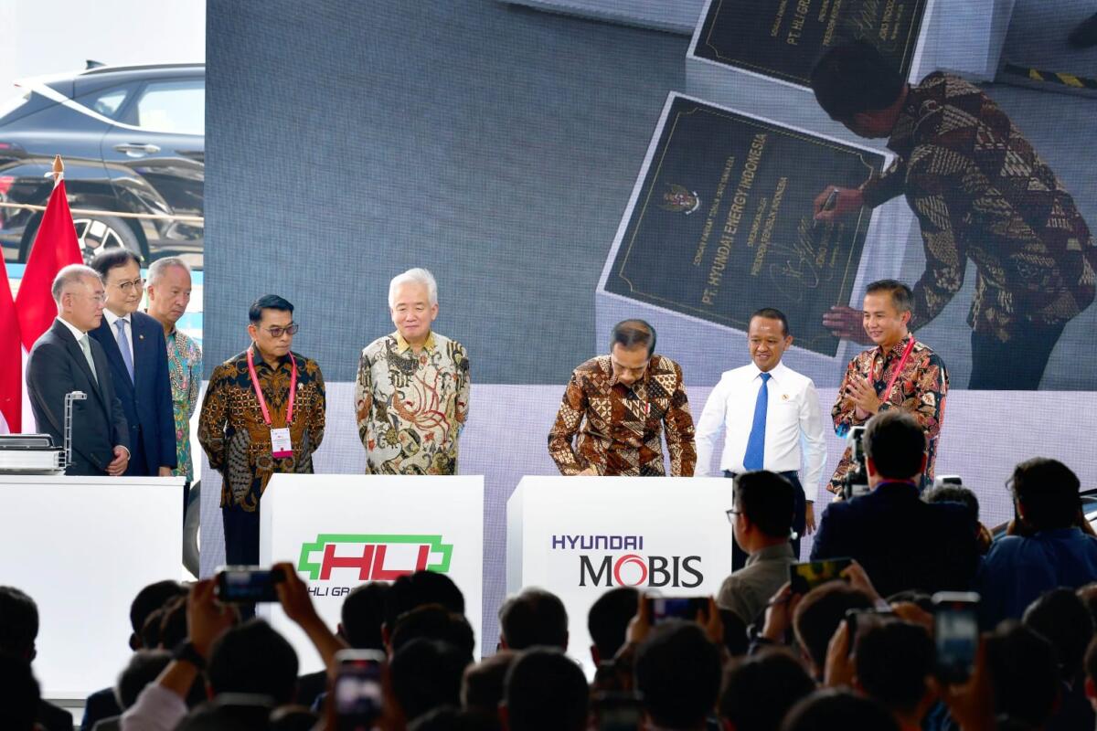 Sebelum peresmian, Jokowi terlebih dulu berkeliling pabrik HLI Green Power yang kemudian menandatangani kap mobil Kona Electric yang pertama kali menggunakan baterai buatan lokal.