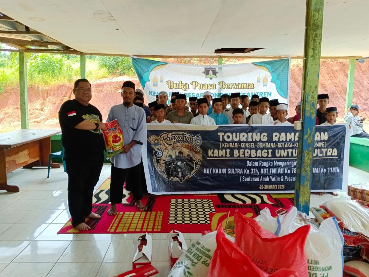 Sultra, Radarsultra.co – Melalui kegiatan Touring Ramadhan, Kamar Dagang dan Industri (Kadin) Sulawesi Tenggara (Sultra), Ikatan Motor Indonesia (IMI) Sultra, dan Pangkalan TNI Angkatan Udara (Lanud) Haluoleo menyalurkan bantuan kepada pondok pesantren dan Panti Asuhan di 3 kabupaten yang dilalui, Sabtu (30/3/2024).