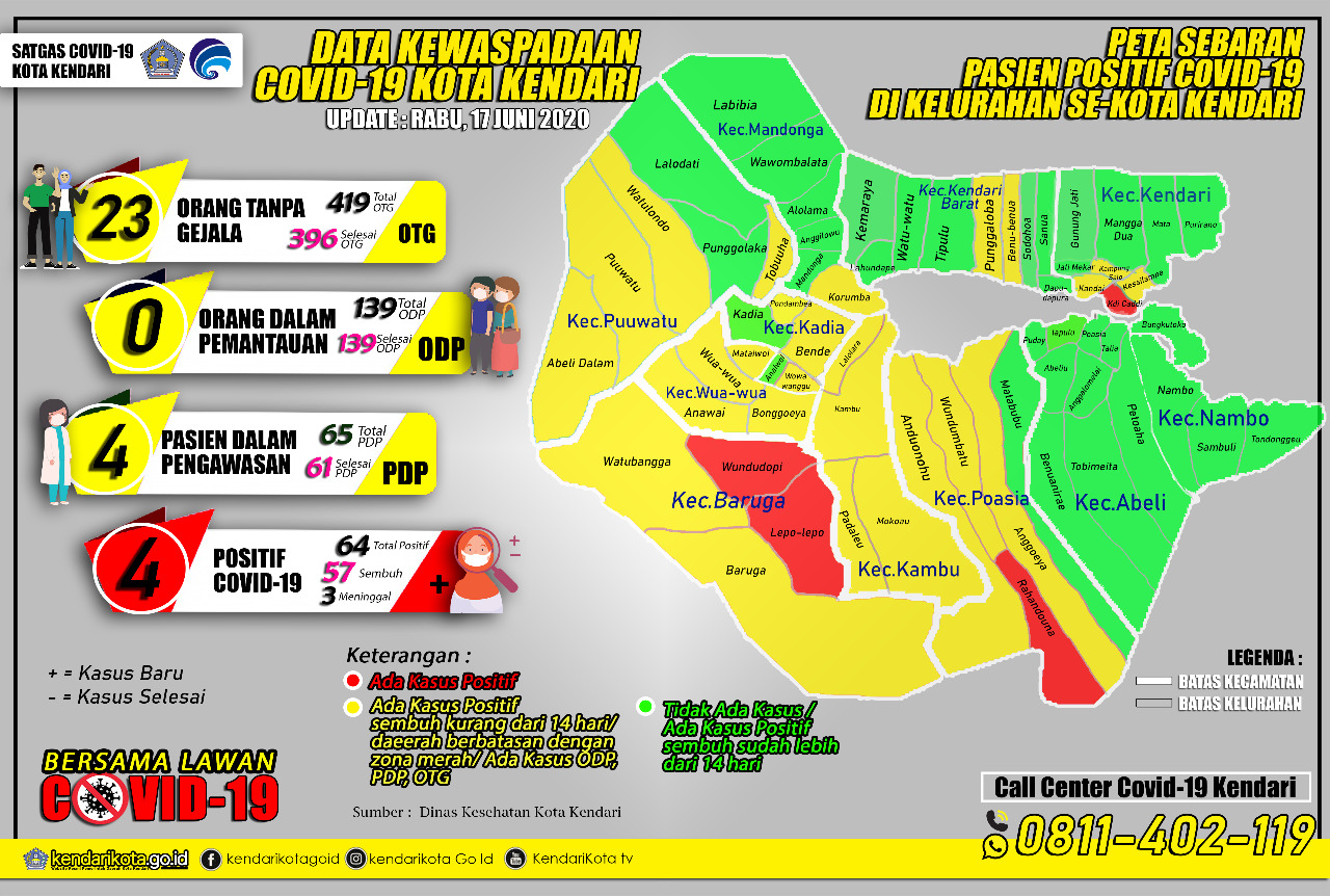 Kendari, Radarsultra.co.id – Sampai dengan Rabu (17/6/2020), kasus positif Corona Virus Disease 2019 (Covid-19) di Kota Kendari menurun jadi 4 kasus dari sebelumnya sebanyak 20 kasus.