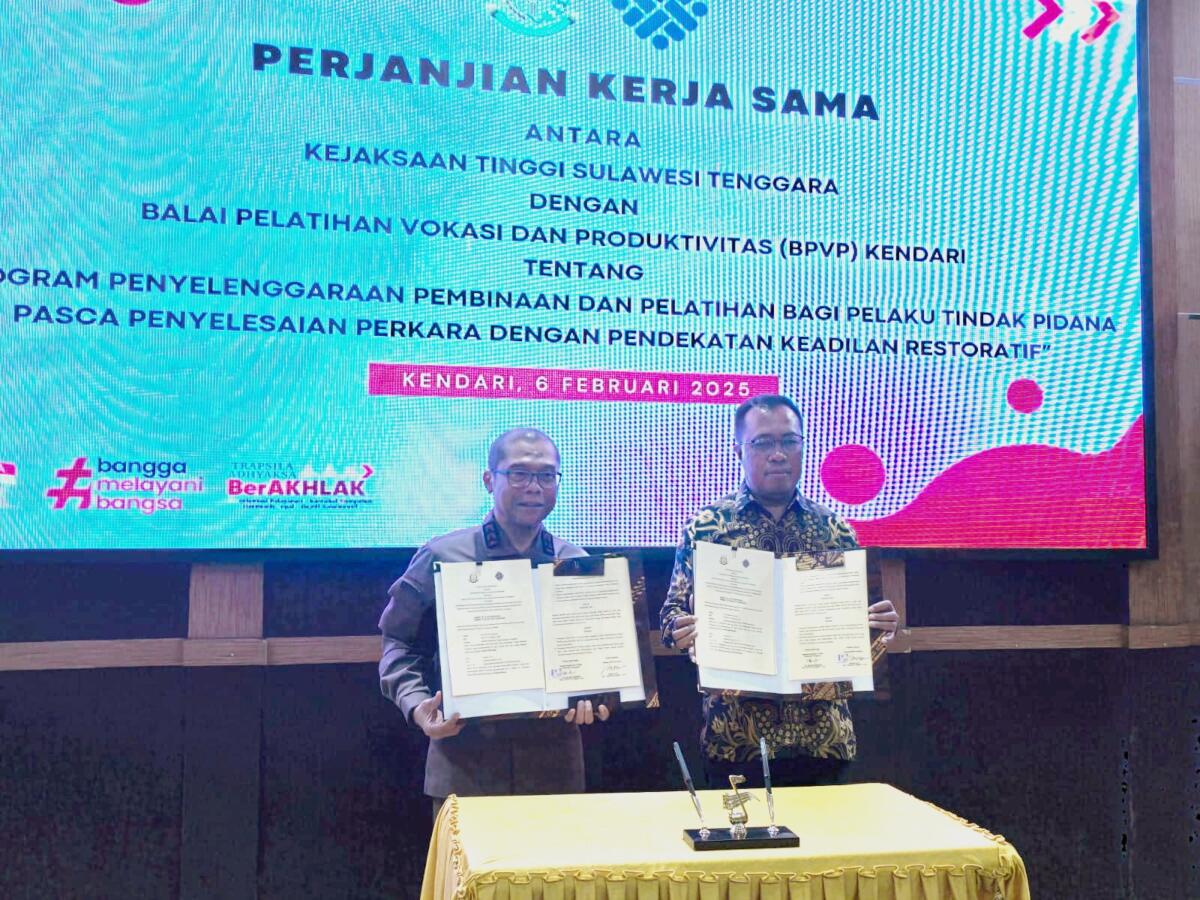 Penandatanganan kerja sama ini dilakukan oleh Kepala Kejati Sultra, Dr. Hendro Dewanto, SH, MH, dan Kepala BPVP Sultra, Amran, ST, pada Kamis (6/2/2025).