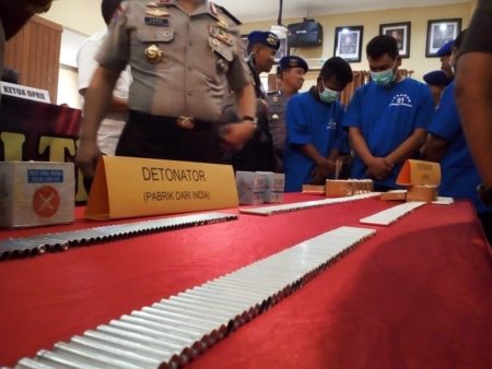 Ratusan karung bahan peledak amonium nitrate dengan berat mencapai 5,375 ton berhasil diamankan dari tangan tersangka SA (inisial) dari Pulau Saponda, Kecamatan Soropia, Kabupaten Konawe Sultra, pada 19 Maret 2018 lalu.