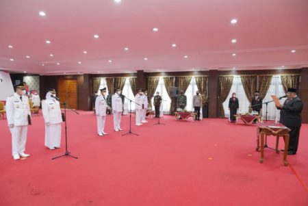 Kendari, Radarsultra.co.id – Gubernur Sulawesi Tenggara (Sultra) Ali Mazi, SH melantik tiga Bupati dan wakil Bupati terpilih dalam Pilkada serentak 2020. Pelantikan dilaksanakan di Aula Rumah Jabatan (Rujab) Gubernur Sultra dengan menerapkan protokol kesehatan ketat, Jumat, (26/02/2021).