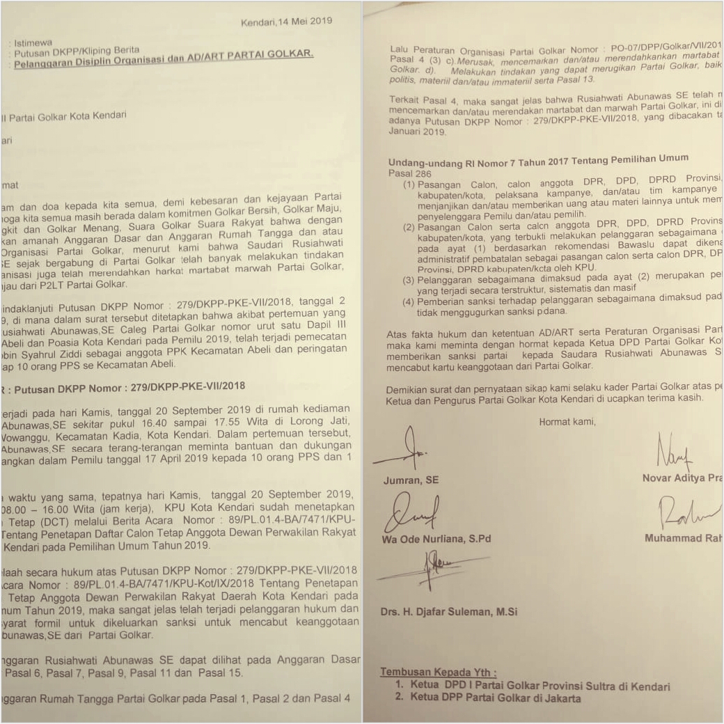 “Pertemuan antara penyelenggara dengan Ibu Rusiahwati Abunawas sekira pukul 16.40 sampai 17.55 Wita. Dalam pertemuan itu, Rusiahwati meminta bantuan untuk dimenangkan dalam Pemilu di Dapil Kecamatan Abeli. Saat yang sama, sekiranya pagi sampai siang, Rusiahwati sudah daftar DCT. Jadi jelas pelanggarannya,” Urai ke lima Caleg dalam surat dengan perihal pelanggaran disiplin PO, AD dan ART Partai Golkar.