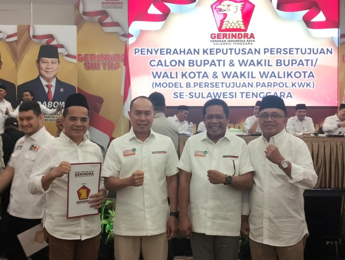 Kendari, Radarsultra.co – Pasangan bakal calon (Balon) Bupati dan Wakil Bupati Kabupaten Konawe Utara (Konut), Sudiro-Rauf, secara resmi menerima Rekomendasi Model B Persetujuan Parpol KWK (B1 KWK) dari DPP Partai Gerindra pada Minggu (25/8/2024).