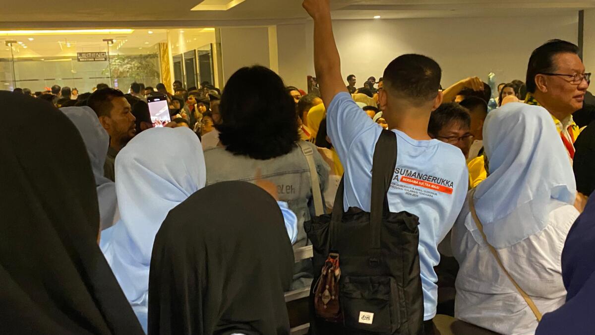 Para pendukung dan simpatisan tersebut memadati lobi hotel dengan seragam menggunakan baju biru bertuliskan “Andi Sumangerukka – Hugua bersama Sultra maju”.