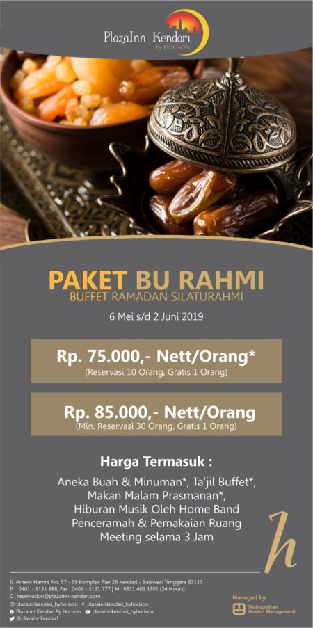 Kendari, Radarsultra.co.id – Di bulan Ramadhan 1440 H kali ini, Plaza Inn Kendari by Horison menawarkan para pengunjungnya sebuah promo spesial buka puasa bersama Bu Rahmi.
