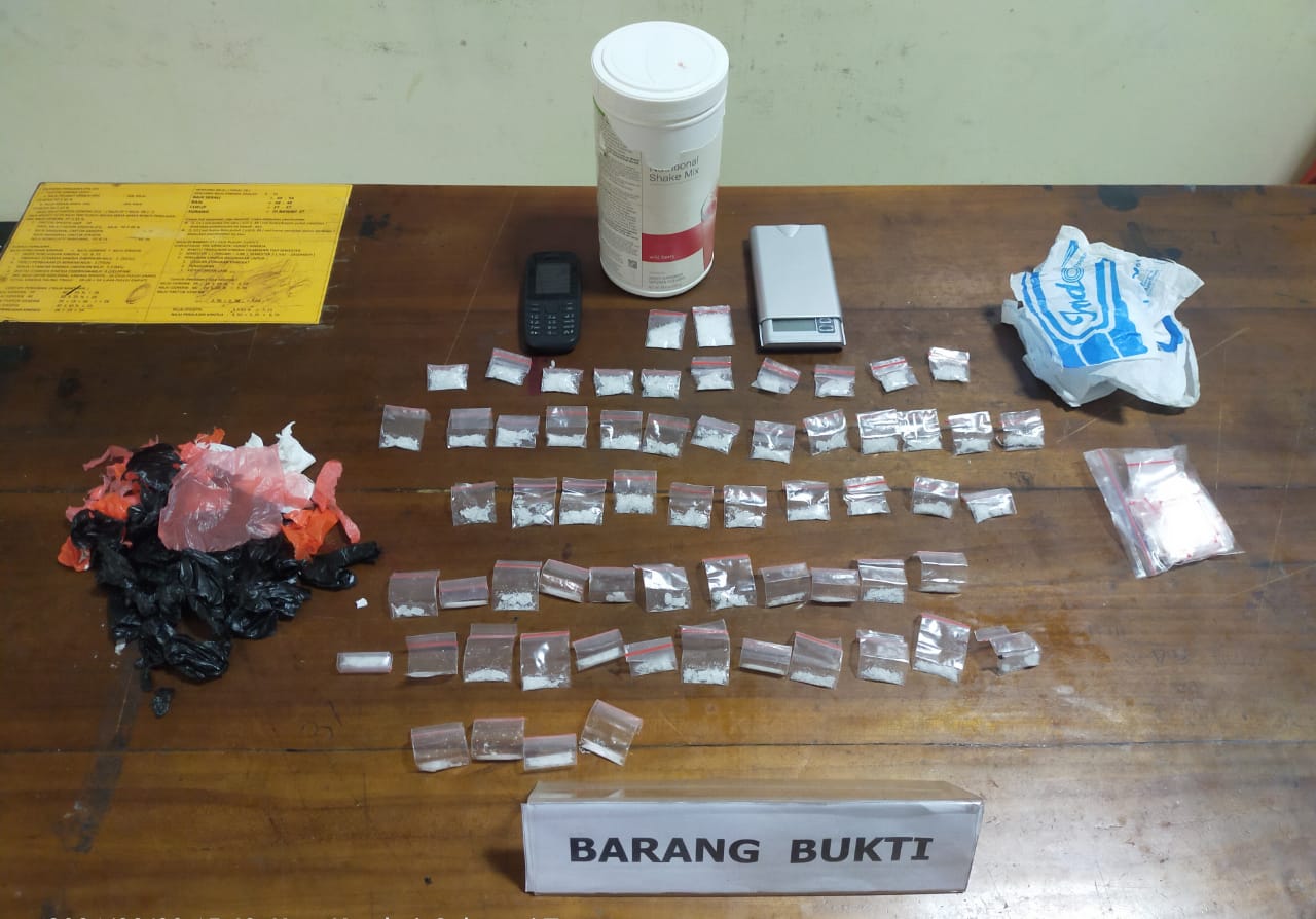 “Tim opsnal melakukan penggeledahan yang di saksikan masyarakat dalam hal ini ketua RT dan masyarakat setempat, dan dari hasil pengeledahan ditemukan sebuah Toples Plastik warna Putih bertuliskan Share Mix yang di dalamnya terdapat bungkusan plastik warna, hitam,warna orange, warna pink dan warna putih dan 2 buah plastik sashet yang diduga berisikan Narkotika jenis sabu dengan jumlah total 62 (enam puluh dua) paket siap edar beserta timbangan digital dan plastik sashet kosong,” ungkap Dolfi.