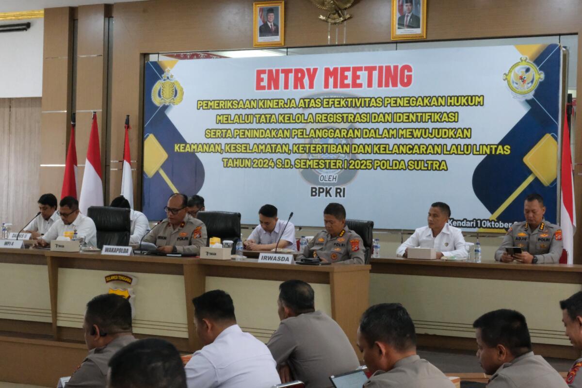 Kendari, Radarsultra.co – Kepolisian Daerah Sulawesi Tenggara (Polda Sultra) melaksanakan entry meeting bersama Badan Pemeriksa Keuangan Republik Indonesia (BPK RI) terkait pemeriksaan kinerja atas efektivitas penegakan hukum melalui tata kelola registrasi dan identifikasi, serta penindakan pelanggaran lalu lintas. Pemeriksaan ini mencakup periode tahun 2024 hingga semester I tahun 2025.