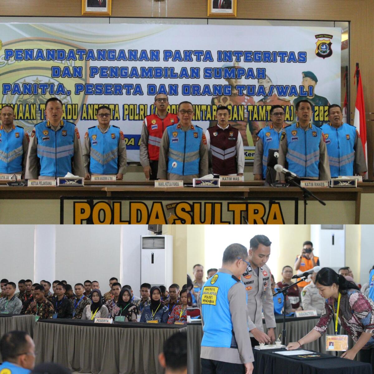 Kendari, Radarsultra.co – Polda Sulawesi Tenggara (Sultra) menggelar acara penandatanganan Pakta Integritas dan Pengambilan Sumpah Panitia, Peserta, serta Orang Tua/Wali dalam rangka Penerimaan Terpadu Anggota Polri T.A 2025.