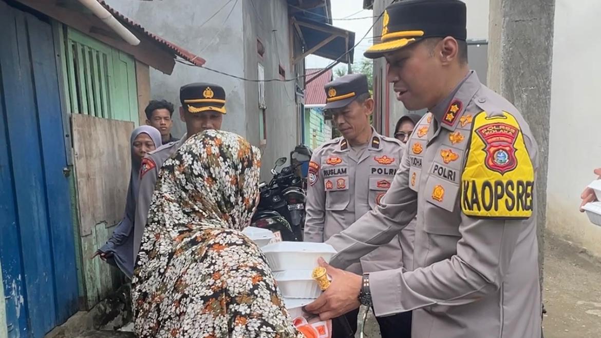 Dalam kegiatan tersebut, aparat kepolisian membagikan nasi kotak secara langsung kepada masyarakat yang membutuhkan.