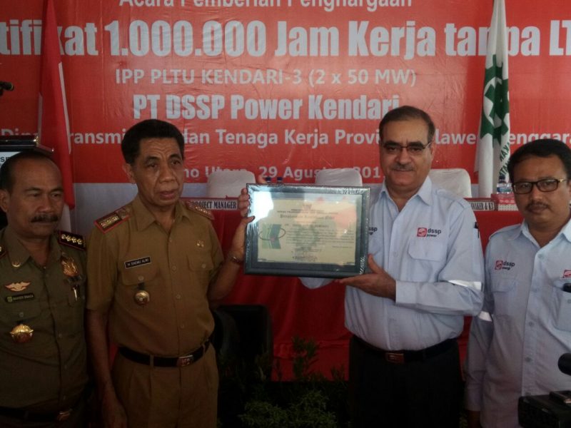 Kepala Disnakertrans Sultra, Saemu Alwi mengatakan, bahwa penghargaan yang diberikan ini merupakan apresiasi pemerintah Sultra atas kerja keras PT DSSP Power Kendari beserta kontraktornya dalam upayanya untuk melindungi keselamatan kerja para karyawannya hingga melebihi satu juta jam kerja.