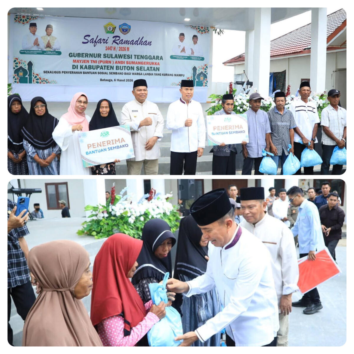 Kendari, Radarsultra.co – Gubernur Sulawesi Tenggara, Mayjen TNI (Purn) Andi Sumangerukka, menyerahkan bantuan kepada masyarakat saat melaksanakan Safari Ramadan di Kabupaten Buton Selatan yang dirangkaikan dengan buka puasa bersama warga dan jajaran Pemerintah Kabupaten Buton Selatan di Rumah Jabatan Bupati, Jumat, (06/03/26).