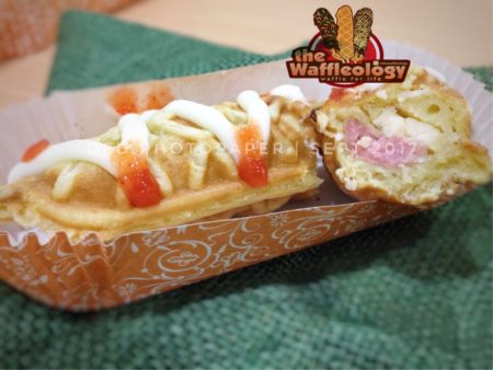 “Untuk isinya itu ada isi coklat, keju, cokju, silvrqueen, sosis keju, greent tea, polos dan pelanggan bisa bebas pilih paduan toping dan isinya” ujarnya saat ditemui di stand The Waffleology, Selasa, (14/08/2018).