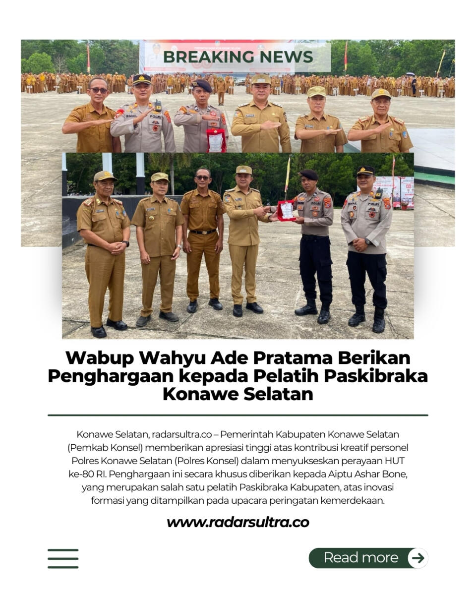 Konawe Selatan, radarsultra.co – Pemerintah Kabupaten Konawe Selatan (Pemkab Konsel) memberikan apresiasi tinggi atas kontribusi kreatif personel Polres Konsel dalam menyukseskan perayaan HUT ke-80 RI. Penghargaan ini secara khusus diberikan kepada Aiptu Ashar Bone, yang merupakan salah satu pelatih Paskibraka Kabupaten, atas inovasi formasi yang ditampilkan pada upacara peringatan kemerdekaan.